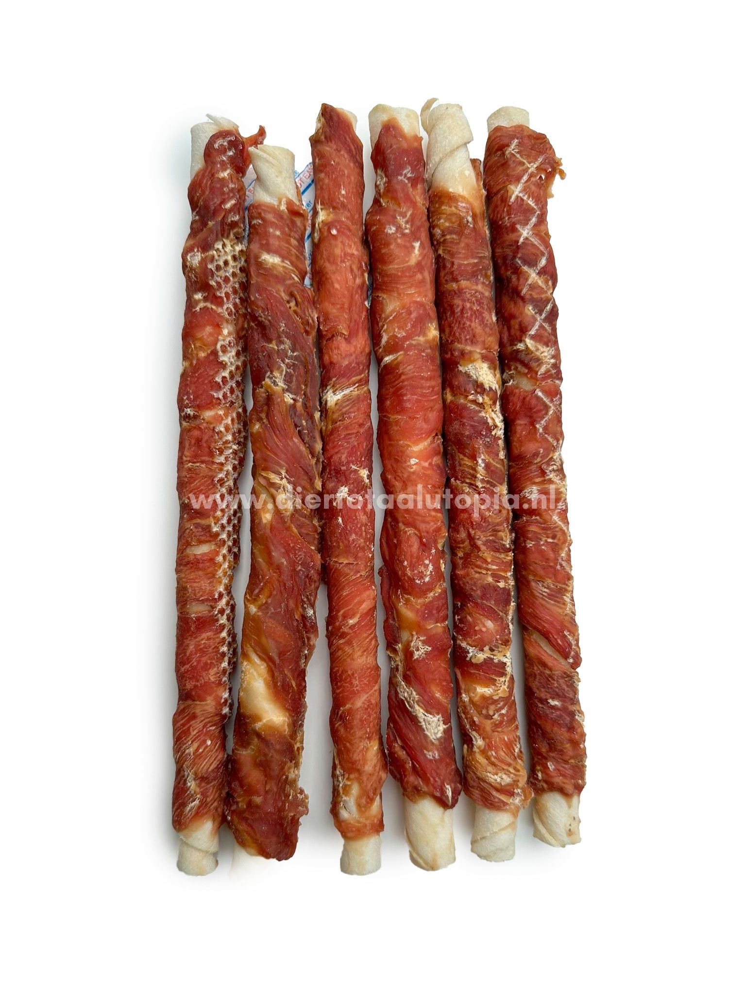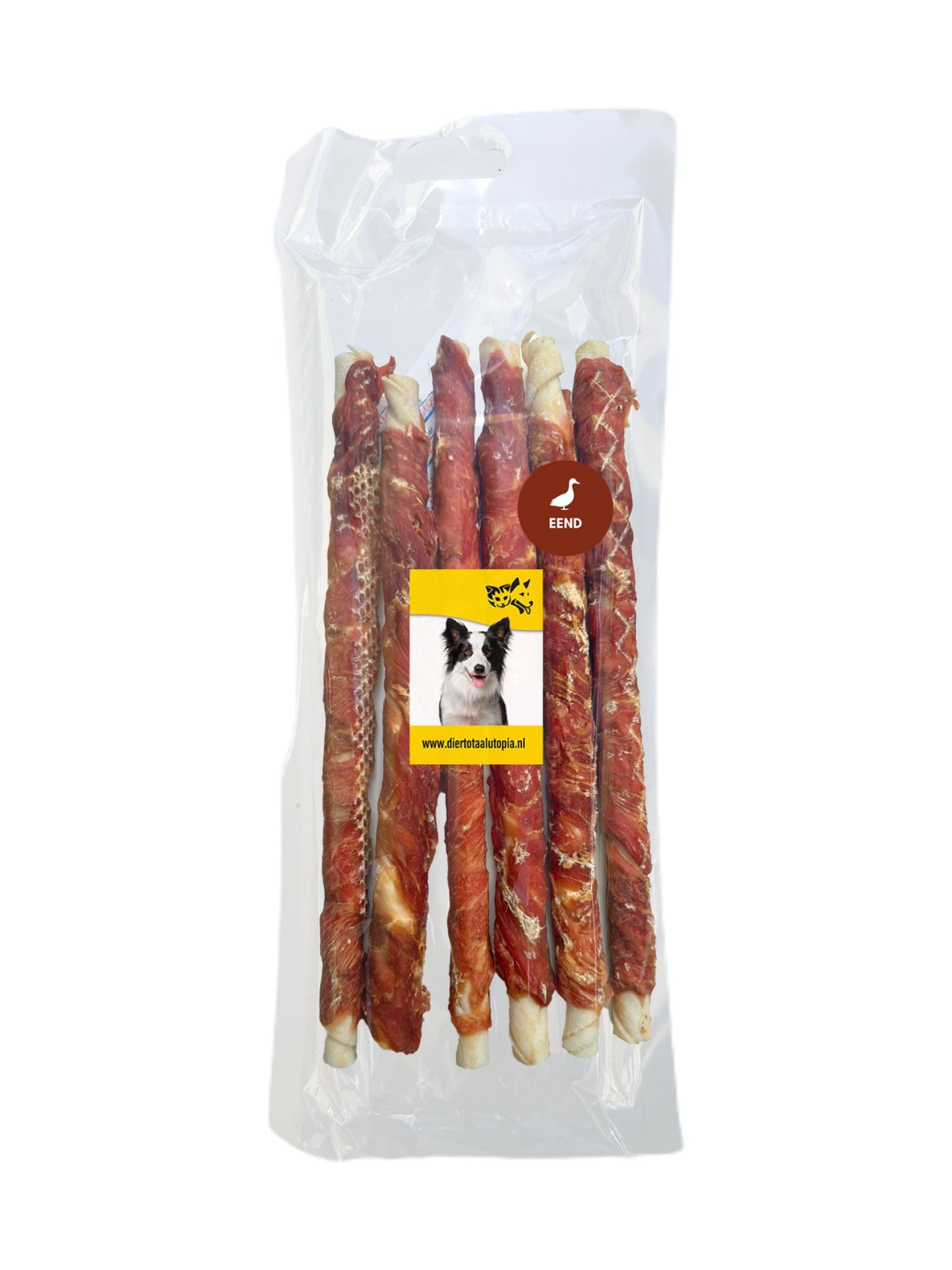 Samenstelling: gedraaide kauwstaaf, omwikkeld met eendfilet