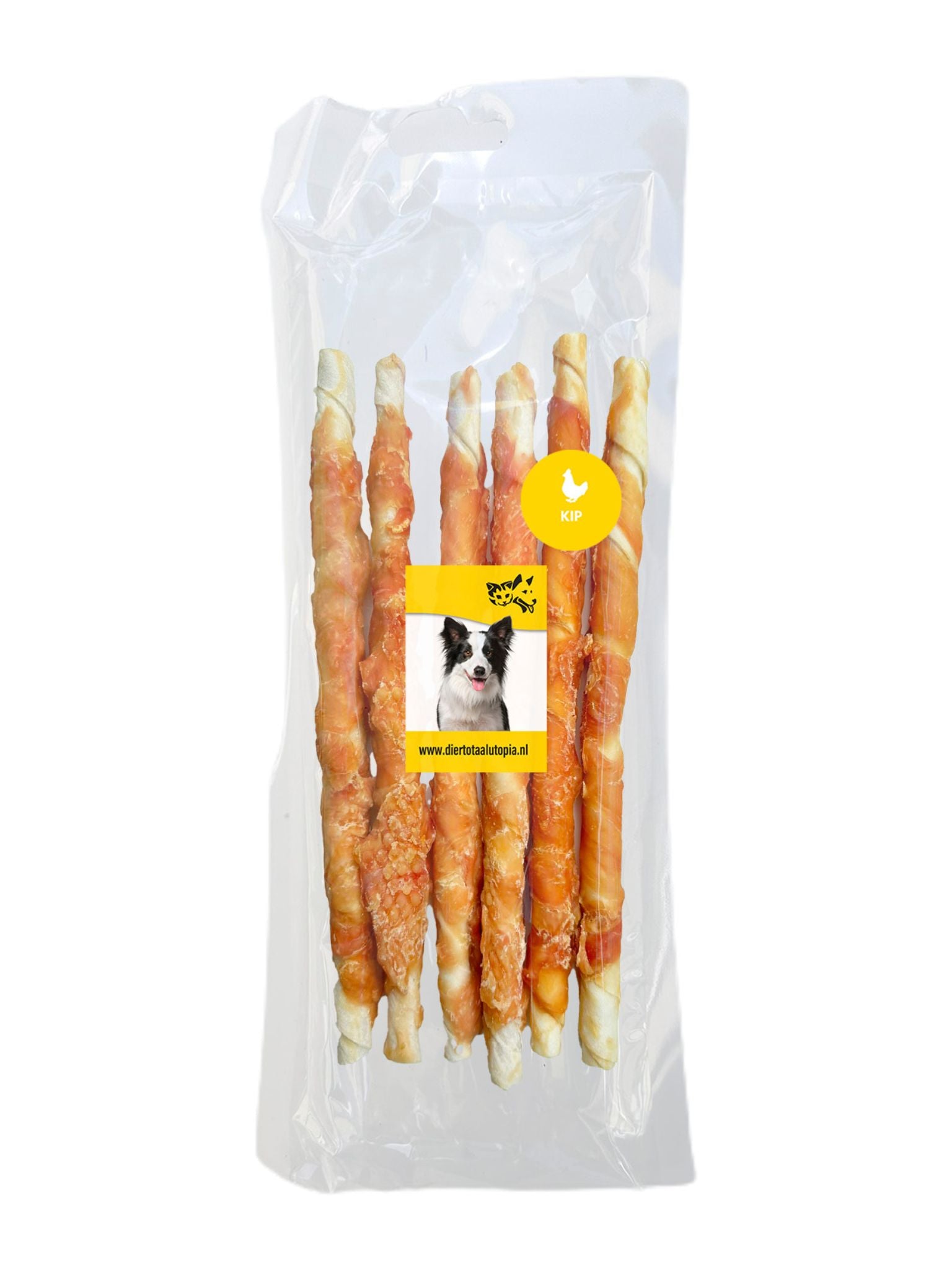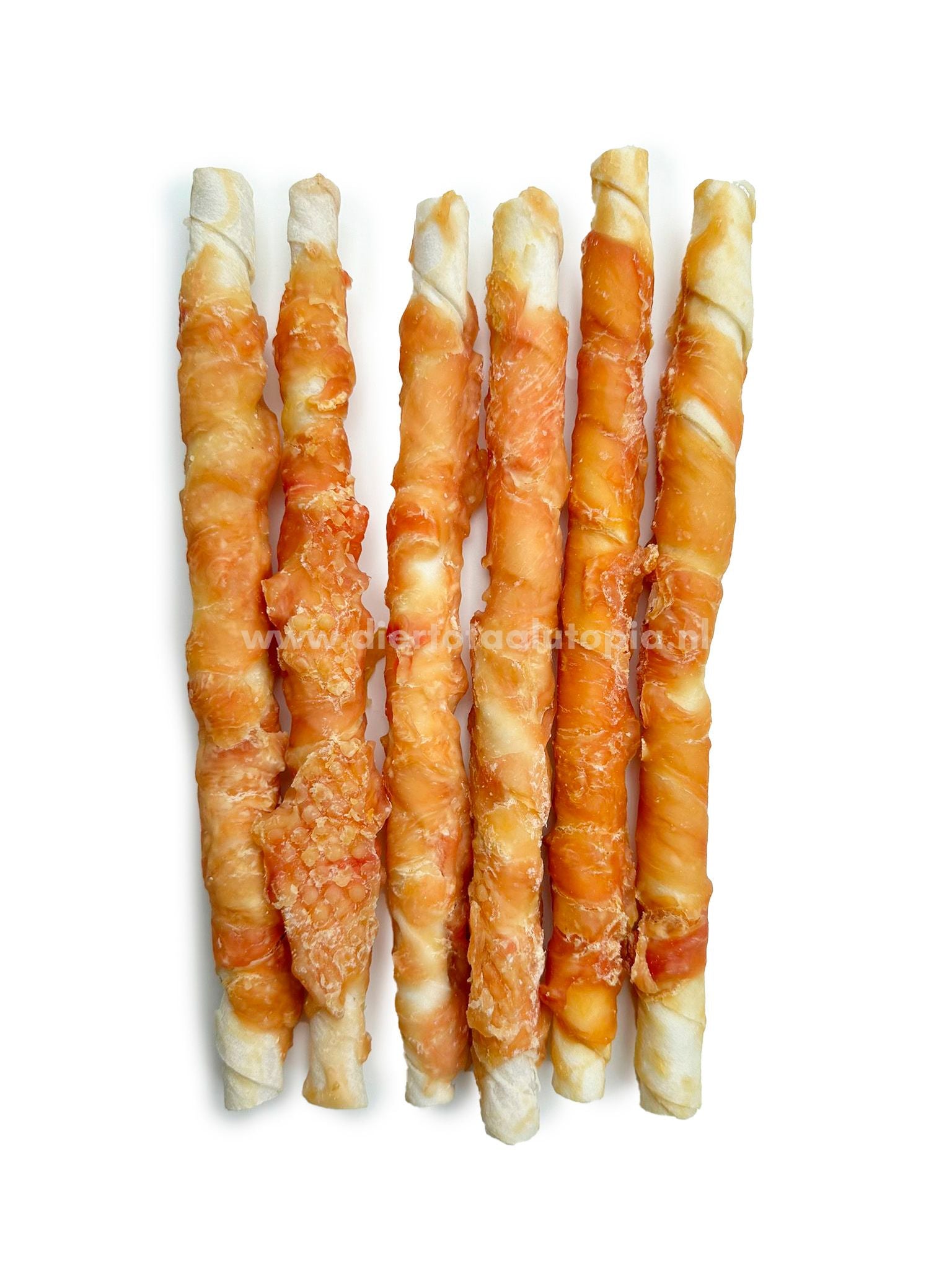 Samenstelling: gedraaide kauwstaaf van onderhuids bindweefsel van rund, omwikkeld met kipfilet