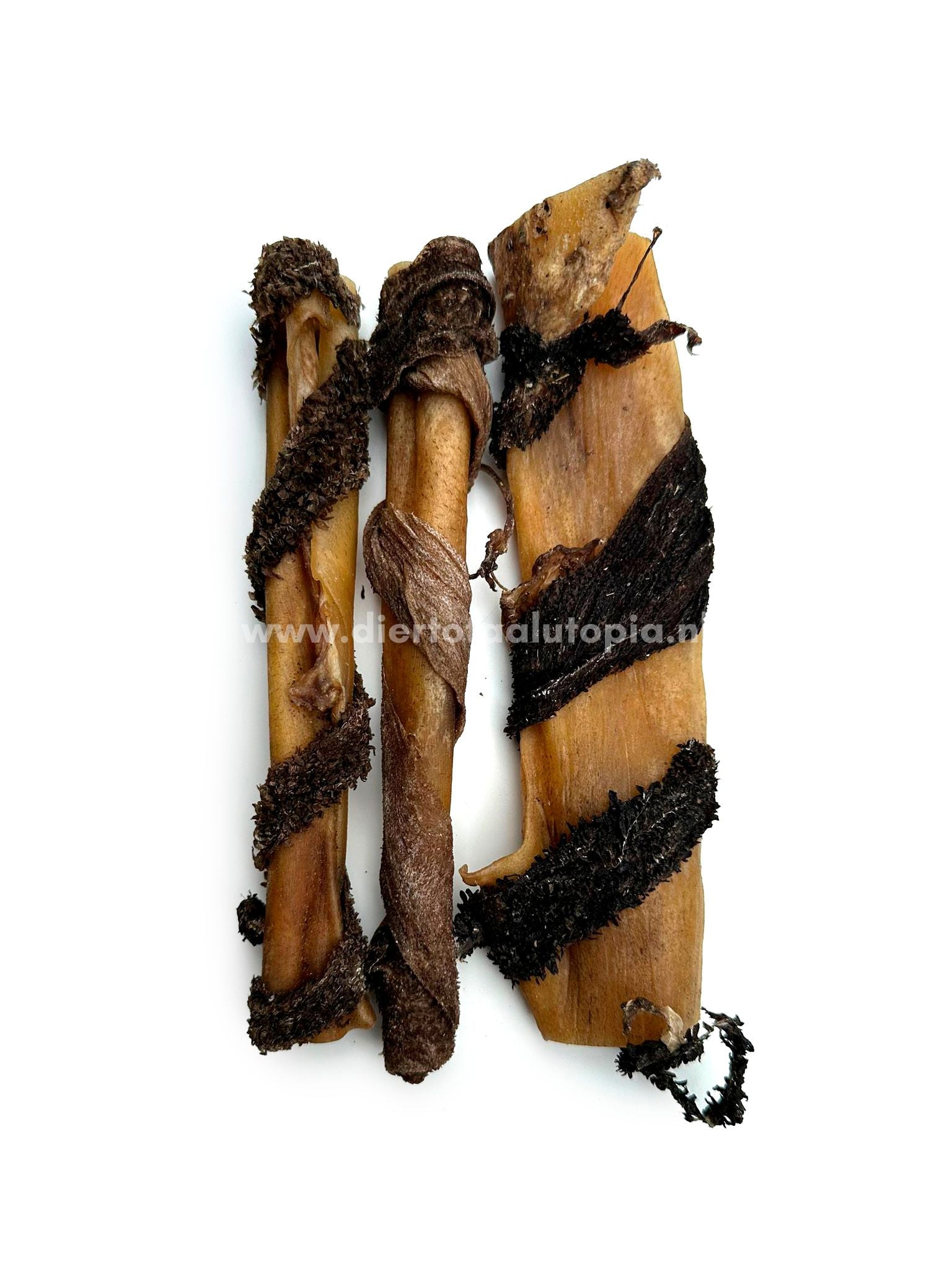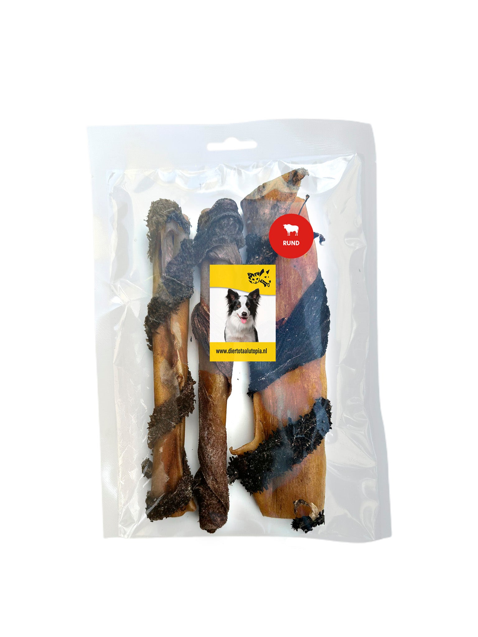 Samenstelling: Kophuid van rund, omwikkeld met pens